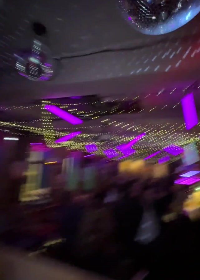 DJ, seemingly female, with her hair pulled back into two buns, wearing headphones and a gray sweatshirt with “SURE” printed on it, singing and moving her arm in the air. She’s at a DJ setup, possibly in a bar or club, with a crowd of people in the background, under purple lighting and a disco ball. The crowd appears to be enjoying the music. The camera is moving and focused on the DJ.
