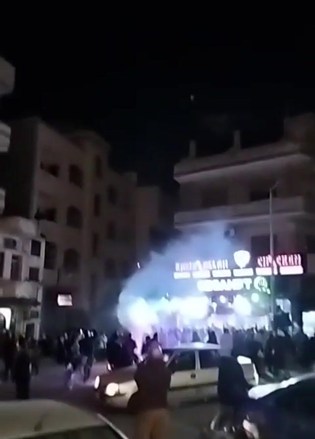 nighttime street scene. A crowd of people is gathered near a street corner, with several vehicles, including cars and motorcycles, parked nearby. There appears to be some sort of event or gathering occurring, as smoke or fog is present near the crowd. Fireworks are being launched into the night sky, exploding into displays of light. Buildings are visible in the background.