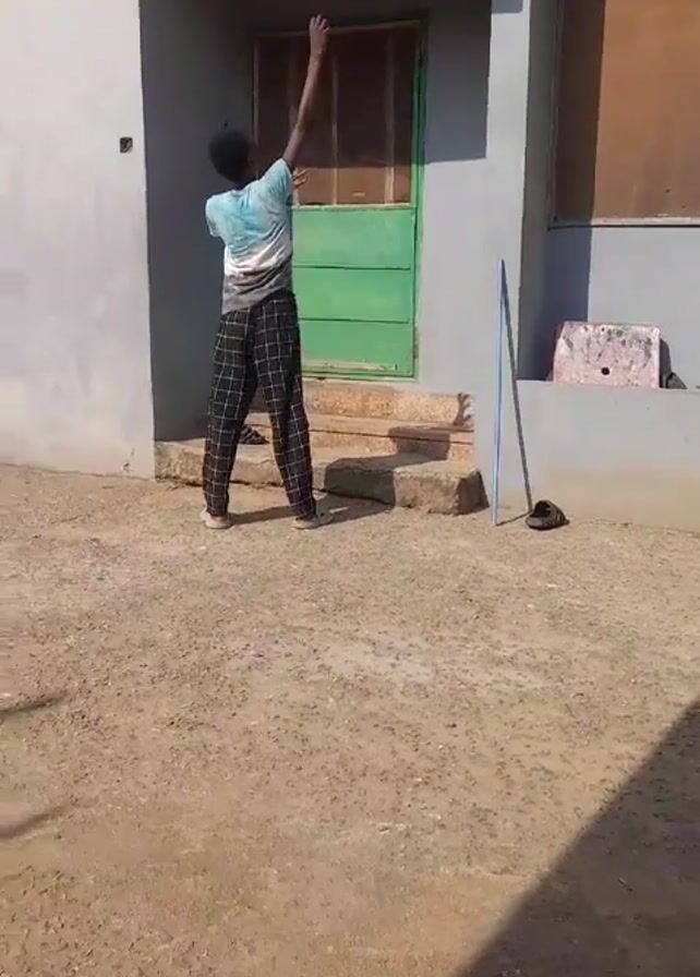 A young person in a light blue tie-dye shirt and black and white checkered pants is seen standing outside a building. They are positioned in front of a green door with some steps leading up to it. The person is looking up and appears to be hitting a white ball that is stuck above the door. The building is painted a light gray color and has a small overhang above the door where the ball is stuck. There is a window to the right of the door with a dark panel. The ground is a dirt surface. There is a long blue object leaning against the building to the right, along with a pair of sandals and a boxy object with pink markings.