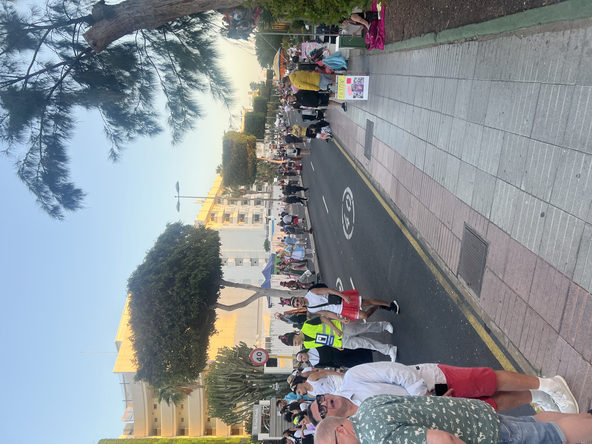 The image depicts a street scene in Playa Del Inglés, Spain, likely during a local event or parade