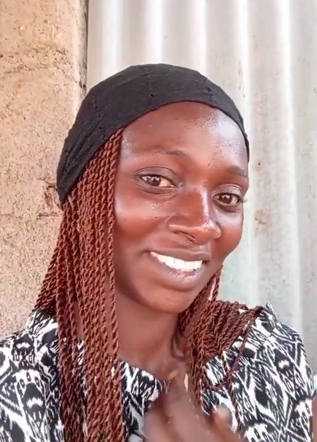 A young woman with brown braided hair, a black head covering, and a black and white patterned sleeveless top is looking directly at the camera and smiling. She is standing outside, with a textured wall to her left and a corrugated metal sheet behind her. She touches her braids and head covering while smiling.