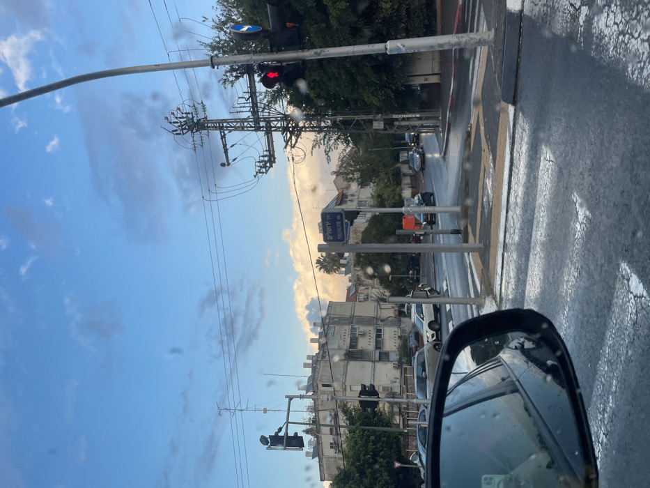 The image depicts a street intersection in Herzliya, Israel, captured from inside a vehicle. Water droplets are visible on the vehicle's window and on its black side-view mirror, which occupies the lower-left foreground. The asphalt roads are visibly wet, indicating recent precipitation, with reflections of surrounding light and objects. The specific location is identified by a blue street sign clearly displaying "ירושלים" (Jerusalem) and "Tchernichovsky 40", situating the scene at or near the intersection of Jerusalem Street and Tchernichovsky Street. The sky shows a mix of blue and white clouds, with some clouds illuminated by a golden light, suggesting early morning or late afternoon. Key elements observed at the intersection include: * **Traffic Signals:** A pedestrian traffic light on the right side of the road displays a red "don't walk" illuminated figure. Another traffic light for vehicles is visible on the left side of the intersection. * **Vehicles:** Multiple vehicles are present on the wet roadway. A silver SUV and a white sedan are stopped at the intersection. A white motorcycle equipped with a large, square delivery box is also visible near the center of the intersection. Additional cars are visible further down the street. * **Infrastructure:** A prominent tall utility pole supporting numerous power lines and transformers is on the right side of the frame. Another utility pole with antennas and wires is visible on the left. White crosswalk markings are distinct on the asphalt. * **Buildings:** Multi-story residential buildings with light-colored facades and flat roofs, some featuring rooftop solar water heaters, line the background. * **Vegetation:** Trees with green foliage, including a palm tree, are interspersed throughout the urban landscape. No discernible individuals are clearly visible on foot.