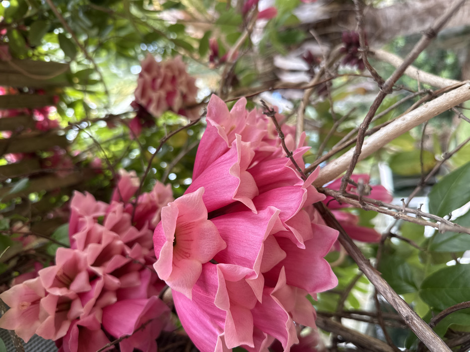 - "The image presents a detailed view of vibrant pink, bell-shaped flowers arranged in dense, pendulous clusters, set within an outdoor environment identified as Dumbéa, France" by FM-BCfsB2, licensed under CC BY 4.0