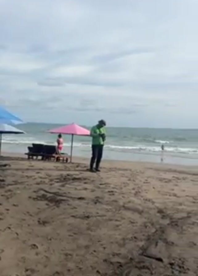 beach scene on a cloudy day. The sand is a brownish color and there are a few people visible. In the foreground, there is a man in a green shirt and dark pants standing on the beach, looking at his phone. Behind him, there are several beach umbrellas and chairs. A person in pink is standing near one of the umbrellas. The ocean is calm with small waves. In the later part of the video, two people are sitting on the sand near surfboards. The sky is overcast, but there is some brightness in the upper right.