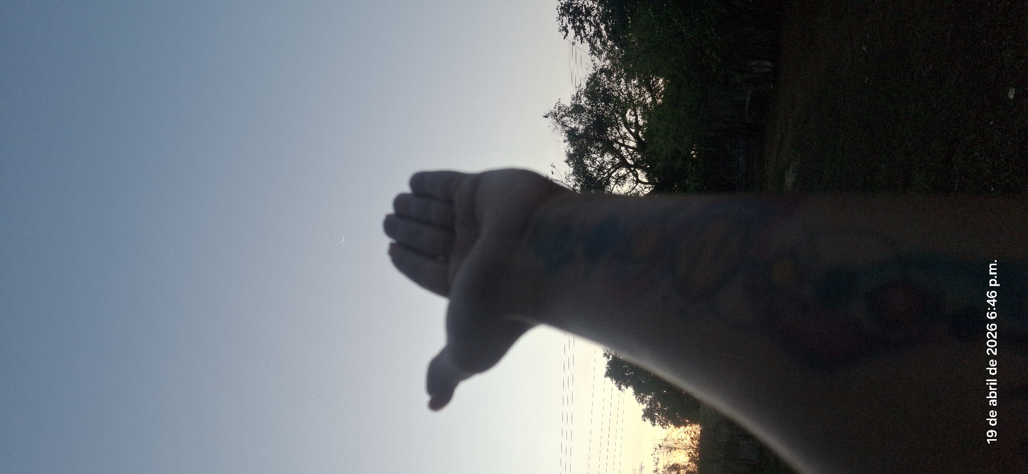 A photograph taken outdoors features a person's arm and hand extended towards the sky. The hand is open with the fingers slightly curled. The arm has a tattoo. The sky is light blue, and a faint crescent moon is visible. In the background, there are trees and some utility lines. The bottom right corner of the image has a timestamp in Spanish: "19 de abril de 2026 6:46 p.m." There is no information on the location.