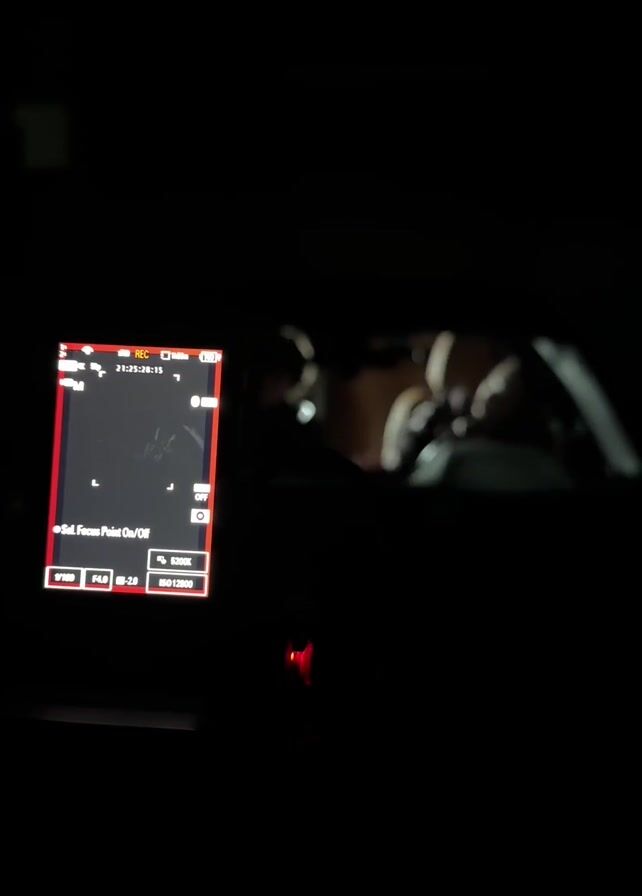 In a dark environment, a video camera screen displays a recording of two people in a car at night. The camera settings are visible on the screen: shutter speed 9769, f-stop 2.0, 6200K, and ISO 12800. The people in the car are blurry and their actions are difficult to discern. The recording appears to be taken from the perspective of someone filming from outside the vehicle.