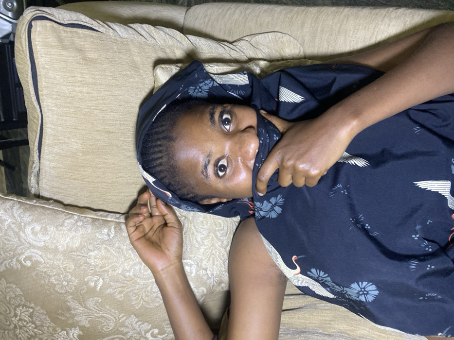 A person lies on a tan patterned couch. The individual is partially covered by a navy blue patterned shawl, covering their mouth. Their eyes are wide and visible, looking directly at the camera. The fabric has a crane and flower pattern. The person's skin tone is dark. Their head is turned. The couch has large cushions.