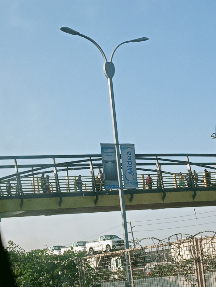 The scene depicts the Machakos Junction Pedestrian Overpass along the Nairobi-Machakos Road (A109) in Machakos, Kenya, under a clear, light blue sky. A tall, grey metallic street light pole with a bifurcated top and two light fixtures stands prominently in the foreground, slightly right of center, extending from the bottom to the top of the frame. The pedestrian overpass, composed of dark grey metal railings and a prominent yellow support beam, traverses the mid-ground horizontally. Approximately 10 to 15 individuals are visible walking across the overpass in various directions. Two vertical banners are affixed to the overpass railing: a light blue banner on the right displays the "Midea" logo, and a partially obscured light blue banner to its left shows "Make yourself at home," "Midea," and the phone number "0713 283 296." Below the overpass, in the lower right and central portions of the frame, three white double-cab pickup trucks are parked or moving slowly, all facing right. These vehicles are positioned behind a grey metal fence topped with multiple strands of coiled barbed wire. Green foliage occupies the lower left foreground, partially obscuring the view of the ground level. A utility pole with associated power lines is visible behind the fence and to the right of the street light pole. The ground beneath the overpass suggests a paved road surface with a subtle atmospheric haze in the distance.