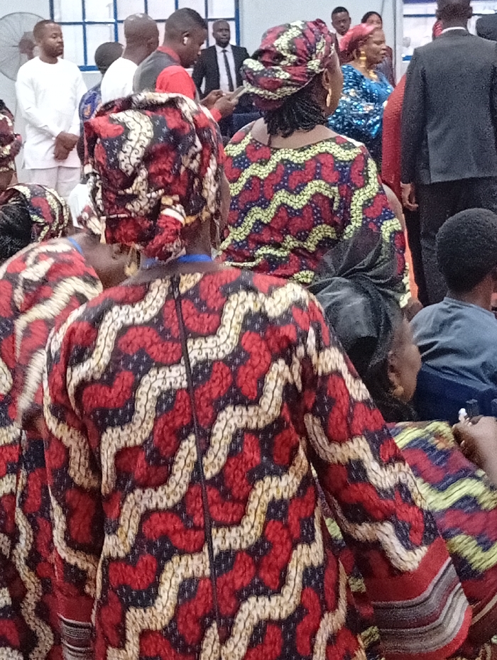 The image depicts an indoor gathering in the city of Television, Nigeria. The scene is dominated by multiple individuals, predominantly women, viewed from the back. Many attendees are dressed in vibrant traditional Nigerian Ankara fabric featuring a repeating pattern of red, dark blue/black, and cream-colored wavy or interlocking shapes. In the immediate foreground, a woman is seen from behind, wearing a long-sleeved garment with the aforementioned red, dark blue, and cream wavy pattern. A black zipper is visible running down the center of her back. To her left, another individual also wears a similar patterned fabric. In the mid-ground, slightly right of center, another woman in a matching patterned top and headwrap (gele) is visible, with gold hoop earrings on her left ear. Several other women with similar attire and headwraps are scattered throughout the mid-ground, some appearing seated. In the background, several men are present. On the far left, a man in a white long-sleeved traditional outfit stands. Near the center-background, a man in a red shirt is observed holding and looking at a smartphone. To his right, another man in a dark suit jacket and white shirt stands. The overall environment suggests a formal or semi-formal event or meeting within a hall or large room, characterized by light-colored walls and overhead structures. Artificial lighting appears to illuminate the scene.