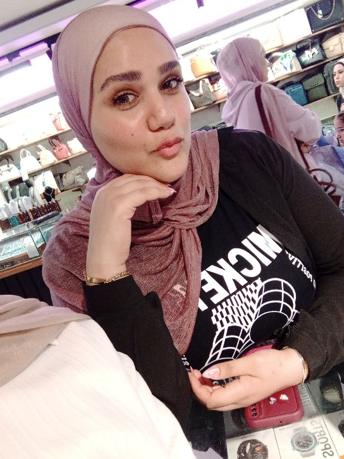 An adult female, appearing to be the primary subject, is positioned centrally in an indoor retail environment in the city of Unknown, Unknown. She has a light-medium complexion, wears a pinkish-mauve hijab, a black long-sleeved top over a black t-shirt with white "MICKEY" text and a geometric pattern, and gold-colored bracelets on both wrists. Her left hand is placed under her chin, and her right hand rests on a dark pink smartphone, which is positioned on a glass display counter. She looks directly at the camera with slightly parted lips. The background reveals shelving units displaying various handbags in shades of white, pink, brown, and black. To the right and behind the primary subject, a second female individual is visible from the back, wearing a light pink hooded garment and a matching hijab, facing the display shelves. A third female individual, wearing a light-colored hijab, is partially visible further right, looking left. In the bottom left corner, an arm and torso wearing a light-colored top indicate the presence of another individual close to the primary subject. The retail space features artificial lighting, including visible purple/pink LED strip lighting. Glass display cases contain small items, possibly jewelry. Promotional material, including images of watches and the word "SPORTS," is visible under the glass counter near the primary subject's right hand.