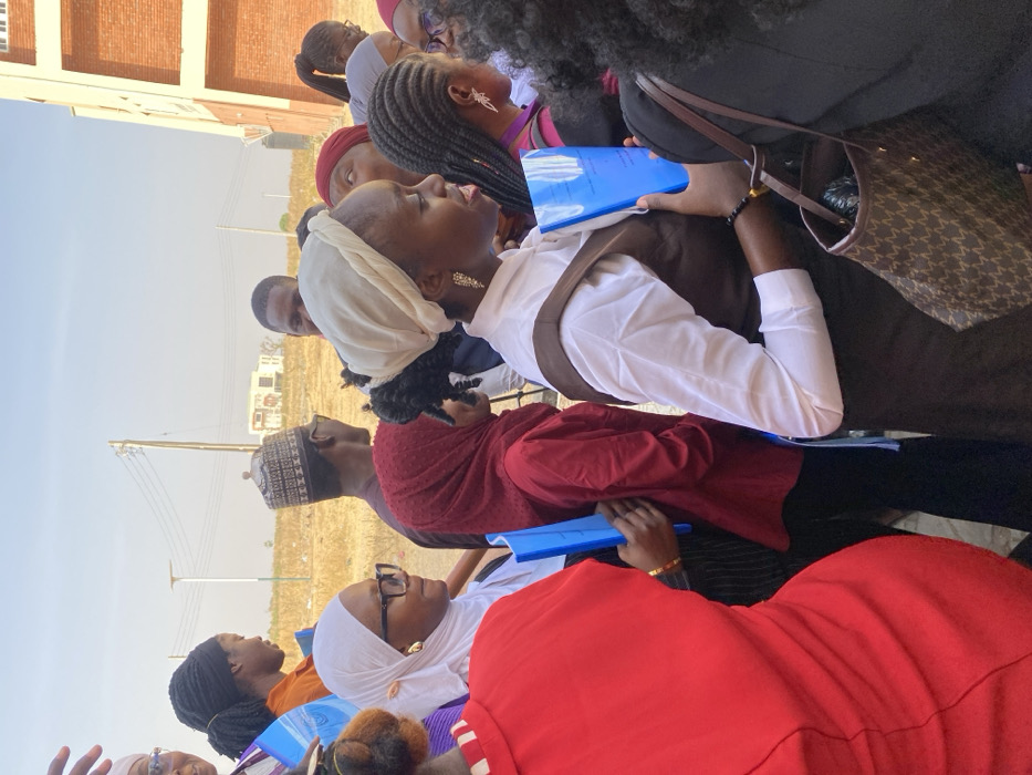 A group of people stand outdoors on a sunny day. Several individuals are visible, wearing different clothing styles. One person is wearing a white headscarf, a white collared shirt, and a brown vest. Another person wears a red top. Several are holding blue folders. The background features a building, a power line, and sparse vegetation.