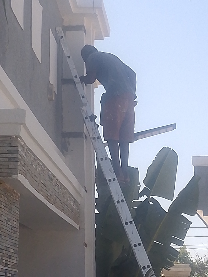 In Kwang, Nigeria, a lone individual is observed performing work on the exterior of a building under clear, bright daylight. The person, wearing a dark long-sleeved top with the hood up and paint-splattered reddish-orange shorts, stands barefoot on a silver-colored extension ladder. The ladder leans against a light-colored vertical architectural pillar, which is part of the building's facade. The individual is bent forward, actively engaged with their hands on the pillar. The building's exterior features a grey main wall, white horizontal and vertical decorative moldings, and a section of light-toned stacked stone cladding. To the right and behind the individual, a rectangular object, possibly a solar panel or construction level, is partially visible, along with large green leaves indicative of tropical foliage like a banana plant.