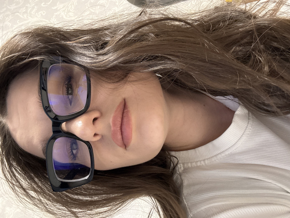 The image presents a close-up, eye-level portrait of a female subject, observed from the upper chest. She wears large, square-framed black glasses with blue-tinged reflections visible on the lenses. Her eyes are visible through the corrective lenses, and her nose is centrally positioned above full lips enhanced with light pink lipstick. Her long, wavy brown hair frames her face and extends beyond the frame's edges on both sides. She is dressed in a white, ribbed crew-neck garment. The background on the left displays a light-colored wall adorned with a subtle textured or patterned wallpaper, while the right side is an indistinct light area. This scene is located in the city of Chaikovsky, Russia.