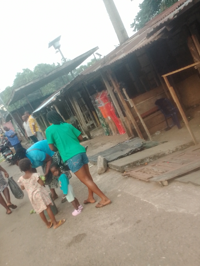 The image depicts an outdoor market or street scene in Neni, Nigeria, under an overcast sky. In the foreground, a paved surface transitions into an unpaved area bordered by a series of makeshift market stalls or small shops. These structures feature corrugated metal roofs and unpainted wooden support beams. One stall displays brightly colored clothing, specifically red, orange, and green garments, on what appear to be mannequins or forms. An empty stall contains a dark plastic chair. A utility pole with an attached solar panel and light fixture rises centrally. Several individuals are present. In the mid-ground, a person in a green t-shirt and denim shorts stands with their back largely to the camera. Adjacent, a person in a blue top is bent over, facing two children. One child, wearing a light-colored patterned dress, holds what appear to be green fruits. A smaller child, dressed in a light blue top and shorts with pink shoes, is looking towards the camera. To the far left, partially obscured, a person in a patterned dress carries a dark bag. In the background, several adult males are visible, including one in a yellow shirt and another in a blue shirt. A motorcycle or scooter is parked on the left side of the scene. Concrete slabs, loose rocks, and a broken wooden panel are on the ground near the stalls.