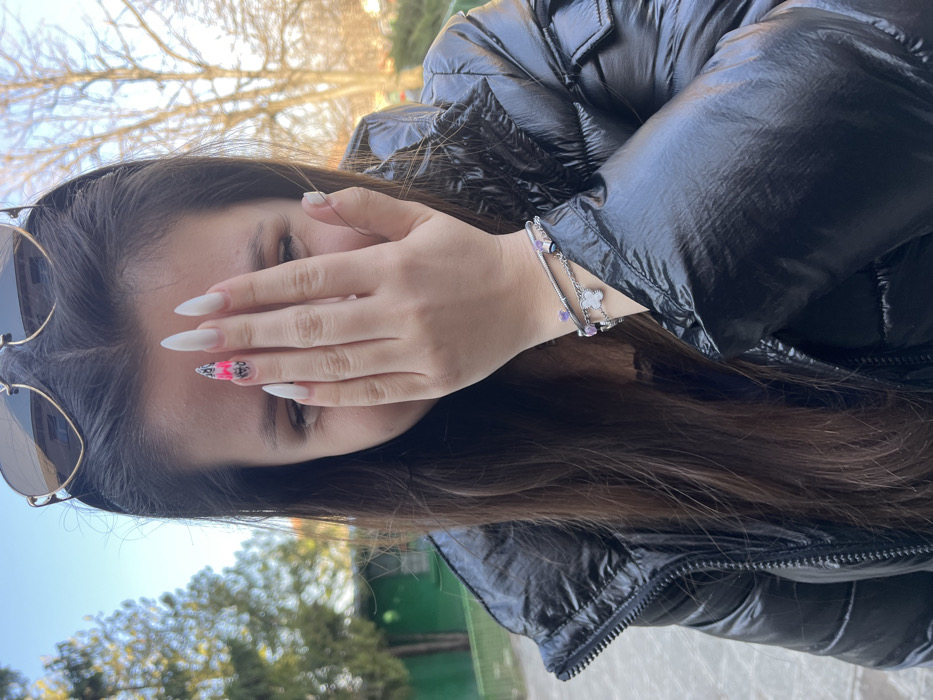 A young female subject is depicted outdoors in Cherven Bryag, Bulgaria. She has long, dark brown hair, with aviator-style sunglasses resting on her head. She is wearing a black, shiny puffer jacket. Her left hand is raised, covering her mouth and nose, while her eyes are squinted, suggesting a smile or laugh. Her fingernails are long and pointed, primarily white, with the ring finger displaying a distinct black base design overlaid with neon pink geometric patterns and white accents. Her left wrist is adorned with multiple silver-toned bracelets, including one with small purple beads and a white four-leaf clover charm. The background features a clear blue sky, bare deciduous trees, and a green fence or wall.