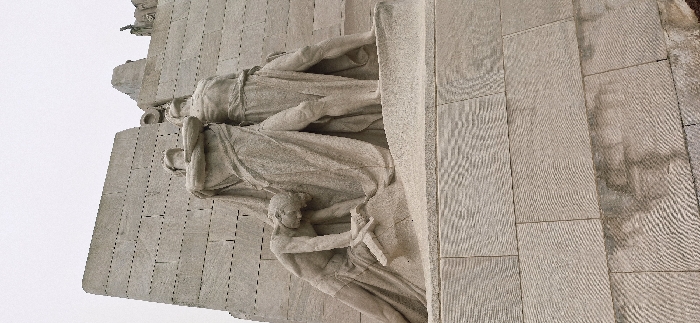 A monochromatic, low-angle view features a light-colored stone monument. Three figures are sculpted in relief, draped in classical robes. A kneeling, youthful figure in the foreground holds an object. Two taller figures stand above and behind, their forms merging with the stone. The stone itself is constructed from large, rectangular blocks. The upper portion of the image contains negative space with hints of other architectural elements.