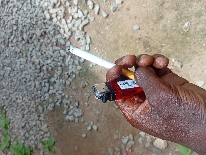 A dark-skinned human hand, positioned in the lower-left quadrant, grips a translucent red disposable lighter and a lit cigarette