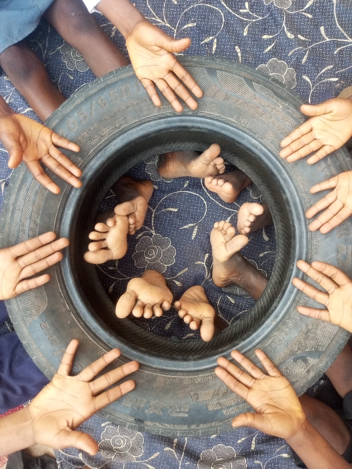 A circular arrangement shows several pairs of bare feet inside a used tire