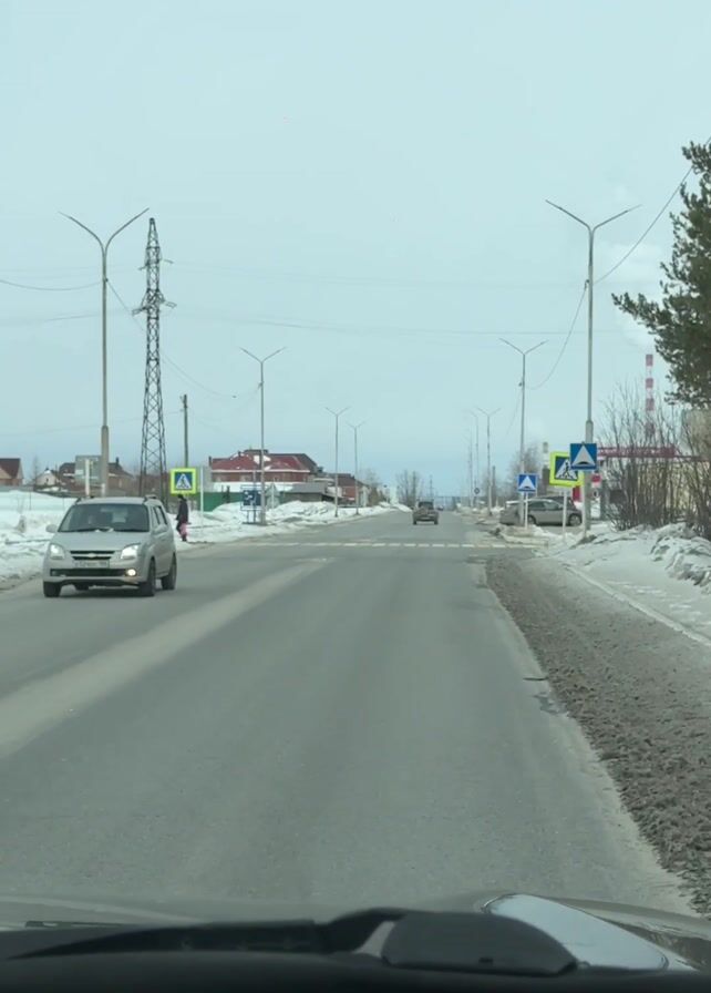 The view from inside a car moving down a paved road shows a typical winter scene in a rural or suburban area. The sky is overcast and the surroundings are generally flat, with snow piled along the sides of the road. A power transmission tower stands to the left of the road. Streetlights are spaced along the road, and various pedestrian crossing signs mark the street at intervals. A silver car passes in the opposite direction. In the background, smoke rises from a distant chimney. A building identified as a "shop" is visible on the right side of the road, marked by a sign in Russian. The overall impression is of a quiet, possibly cold, day on a relatively empty road.