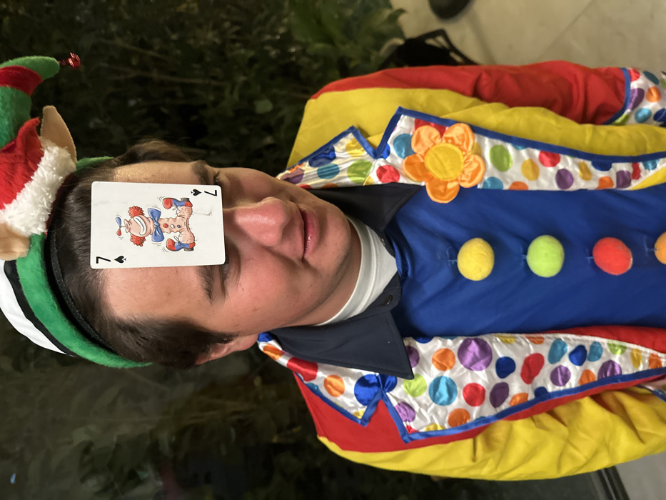 A person dressed in a clown costume and an elf hat lies on their back. A playing card, the 7 of spades featuring a clown illustration, rests on their forehead. The costume includes a blue shirt with colorful pom-poms down the front, a yellow and red jacket with polka-dotted trim, and an orange flower. The elf hat is green, white, and red with dangling tan ears. The person appears to be sleeping.