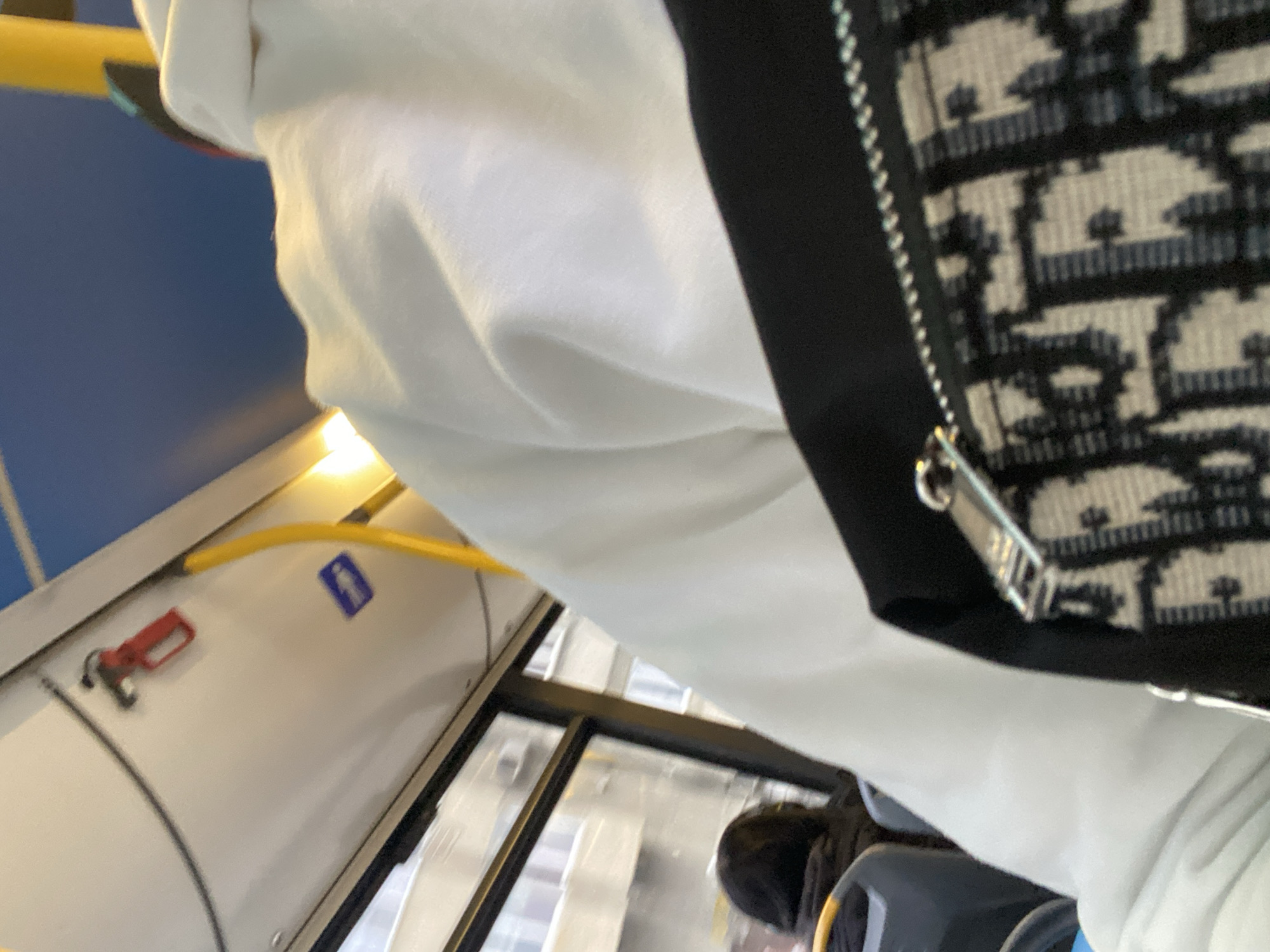 partial view from inside a public transportation vehicle, potentially a bus or tram in Varna, Bulgaria. **Environment:** The interior features a blue ceiling, white side panels, yellow handrails, and a window showing exterior buildings. A blue sign is visible. **Objects:** A red emergency hammer is attached to the side panel. A "Dior" logo patterned zipper closure is visible on a bag or garment. **People:** Another passenger is partially visible through the window. **Actions:** The image likely captures a passenger traveling on public transportation, possibly looking out the window. The composition of the shot indicates it was likely taken from a subjective viewpoint by one of the passengers on the vehicle.