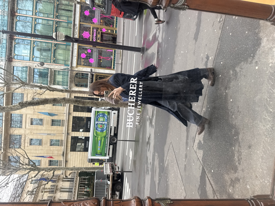 This image is a reflection in a storefront window on Boulevard des Capucines in Paris, France, identified by the prominent "BUCHERER FINE JEWELLERY" text overlaid on the glass. The scene depicts a wet Parisian street and surrounding buildings under an overcast sky, with leafless trees indicating a colder season. In the foreground, a female individual with long brown hair and glasses is reflected walking from left to right. She is wearing a dark, long overcoat, dark trousers, and brown boots. She holds a light-colored smartphone in her raised right hand, seemingly taking a photograph or video. A dark bag is slung over her left shoulder. Behind the reflected individual, a white delivery truck with a large green Heineken beer advertisement on its side is visible on the street. A person in a yellow high-visibility vest stands near the front of this truck. Further to the right, a partial reflection of a red vehicle and the lower half of another pedestrian in dark pants and brown shoes are present. Across the street, several multi-story buildings with classic Parisian architecture are reflected. One building on the left displays a French flag and a light blue flag. The reflection of "DIOR" is visible on its ground-floor windows. Another building on the right features multiple windows with decorative pink snowflake-like patterns and the reflected text "KIMPTON." The sidewalk in the immediate foreground appears damp.