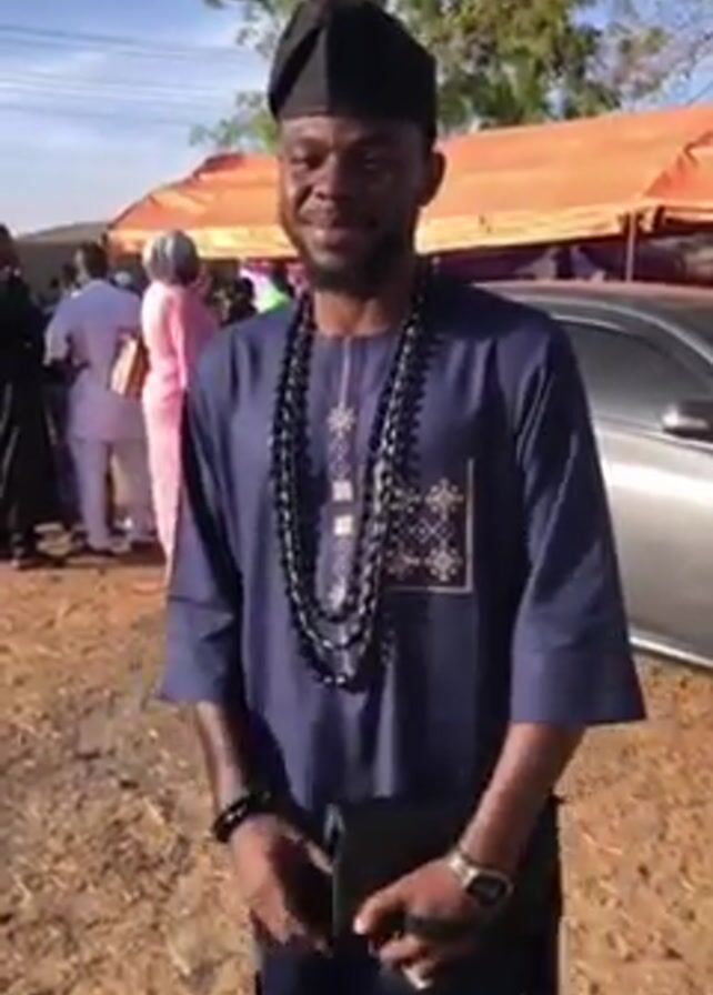 A medium shot captures a smiling man outdoors. He is dressed in a navy blue traditional outfit with a matching black hat, a triple-strand black beaded necklace, and a black beaded bracelet on his left wrist. He holds a black clutch in his left hand and wears a watch on his right wrist. Behind him, several individuals mingle near a beige tent or canopy. A silver car is also visible to the right. The ground is covered with brown dirt or mulch. The sky is light blue.