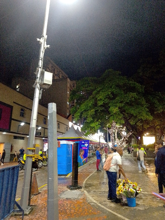 This image captures an illuminated, wet urban pedestrian area at night in Caracas, Venezuela, following recent rainfall. The scene features multiple individuals, market stalls, and a prominent public utility infrastructure. In the foreground, a tall, grey light pole fitted with multiple surveillance cameras and a rectangular electrical enclosure extends upwards. To its left, a blue metal barrier is partially visible. A grey concrete bollard stands to the right of the light pole's base. The ground is dark and reflective, indicating moisture. To the immediate left of the pedestrian path, a building with a tan facade and dark pink accents is visible, featuring several small rectangular windows. Parked motorcycles, primarily yellow, are visible on the wet street next to this building. Along the central and right portions of the pedestrian path, various people are present. A man wearing a white shirt, dark pants, and a light-colored backpack is positioned centrally, bending over a blue bucket filled with an assortment of colorful flowers. To his right, another man in a dark jacket stands, appearing to hold a cigarette. Further along the path, a large tree with dense green foliage is visible, and another tree is wrapped in decorative white string lights. A series of market stalls or event tents with white awnings and colorful bases lines the right side of the path. A blue portable toilet, featuring a roof striped in yellow, blue, and red (resembling the Venezuelan flag), is prominent. Attached to this toilet is a "Zona Wifi" sign displaying an image of a woman using a mobile phone. Various other individuals are dispersed throughout the background, walking or standing amidst the stalls. Tall, dimly lit buildings rise against the dark night sky in the background.