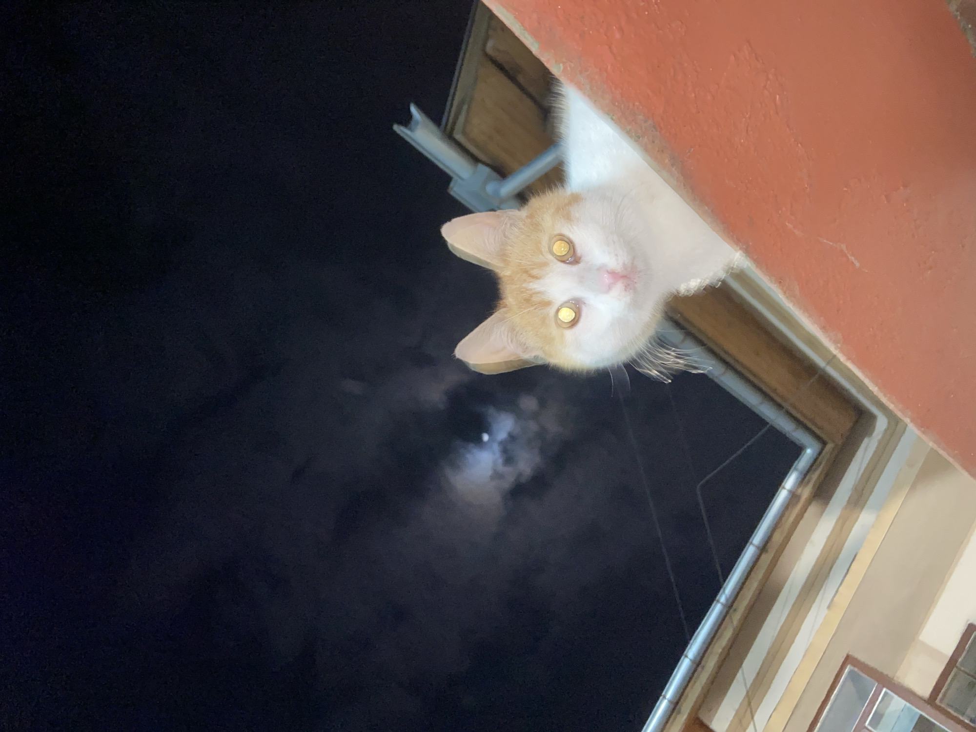 - "A low-angle nighttime photograph captured in Gulyantsi, Bulgaria, shows a domestic cat with orange and white fur peering over an orange-red painted ledge or wall, occupying the lower right and central portions of the frame" by FM-JPbCw2, licensed under CC BY 4.0