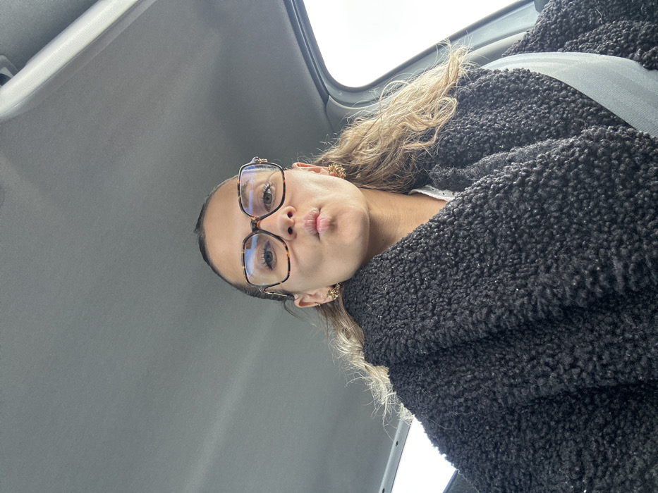 A female individual is depicted in a vehicle in Villars, France, captured in a close-up, slightly upward-angled shot. She has light brown, wavy hair and is wearing large, square-framed eyeglasses with a tortoiseshell pattern. Her lips are pursed forward. She exhibits two gold-toned, spiky-design stud earrings. Her attire consists of a thick, black, textured coat, beneath which a white collared shirt with small dark dots is partially visible. A light grey seatbelt diagonally crosses her chest. The vehicle's grey headliner is visible in the upper portion of the frame, and a bright, overcast exterior is visible through the passenger-side window.