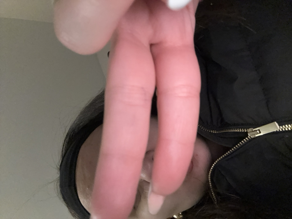 The image captures a close-up, upward-angled view of an individual, positioned in the city of Radomir, Bulgaria, partially obscuring their face with their own hand. Two fingers are extended horizontally across the mid-frame, concealing the subject's eyes and upper nose. Visible features include the lower portion of the nose, a mouth with slightly parted, pink-tinted lips, and the chin. The subject wears a black headband across their forehead and has dark hair visible on the sides. A gold-colored hoop earring is present in the visible left earlobe. The individual is dressed in a black, possibly padded jacket with a partially unzipped gold-colored zipper. The visible fingernail on the upper finger displays a pale/nude polish, while the tip of the lower finger shows white nail polish. The background consists of a plain, light-colored surface, suggesting an indoor environment without distinguishing features.