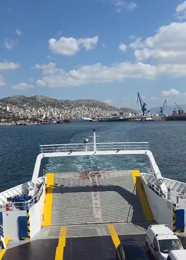 From the back of a ferry, the view looks towards a cityscape, with a harbor area featuring cranes. The deck of the ferry is visible, with cars parked on it. The sea is choppy, and the sky is blue with scattered clouds.
