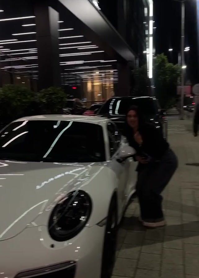 woman posing next to a white Porsche. The woman, wearing a black jacket and jeans, leans against the car, smiles, and makes a peace sign with her fingers. The car is parked on a cobblestone-paved area near a modern building with the words "TREE..." on the side. The scene is lit with streetlights. Behind the Porsche, there's a black vehicle and another man walking. It's nighttime.
