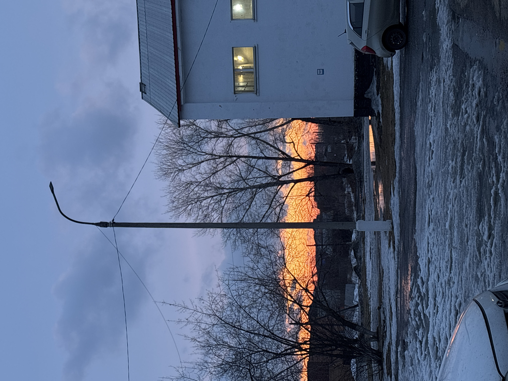 This image captures an urban scene in Tayshet, Russia, at dusk during late winter or early spring conditions