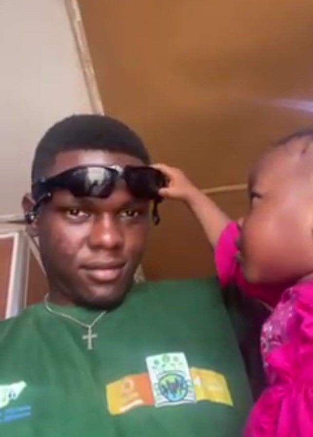 A man is standing indoors holding a young child, presumably a toddler. The man has short black hair, is wearing a green T-shirt with logos on the front, and a silver cross necklace. He is wearing black sunglasses on top of his head. The child is wearing a bright pink ruffled shirt and has small earrings. The child reaches up and moves the man’s sunglasses. The man then removes the glasses and lifts them up to above the child’s head. The background consists of a painted wall and a wooden ceiling with a fluorescent light.