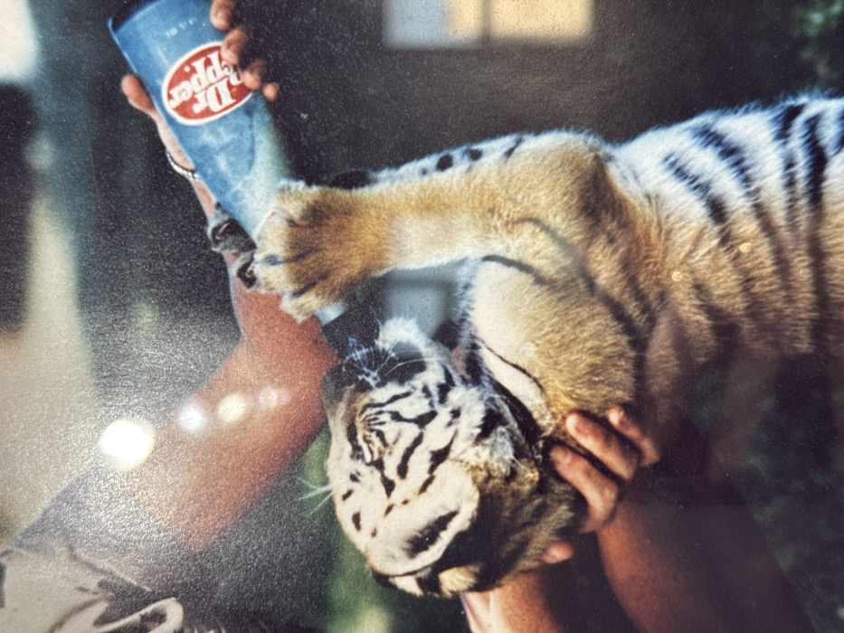 - "A baby tiger is held by two arms and fed from a blue bottle of Dr Pepper" by FM-avfjN2, licensed under CC BY 4.0