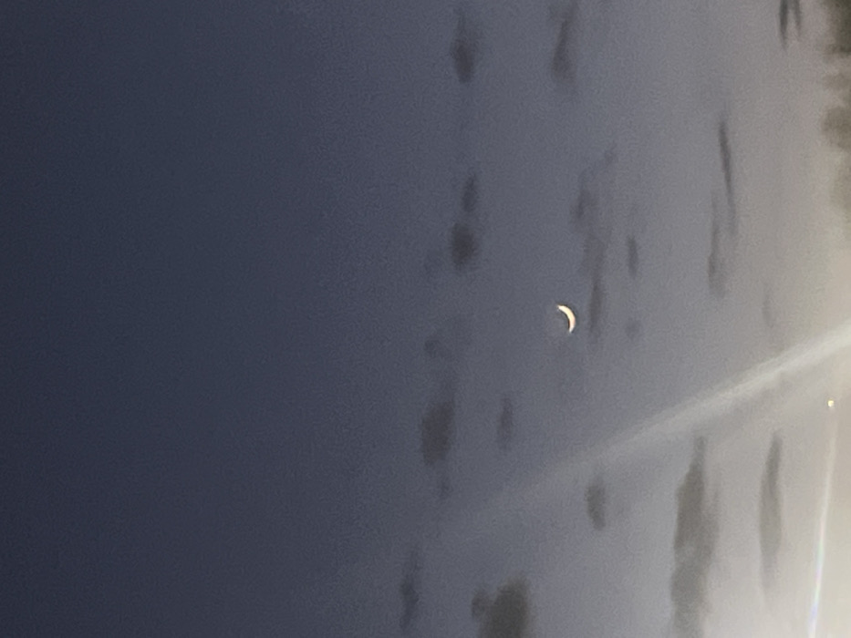 The image displays a twilight sky over Ромашка Нп, Russia. The upper portion of the sky is a dark, desaturated blue transitioning to a lighter grey-blue towards the horizon. A distinct, slender crescent moon, illuminated on its right side, is positioned slightly above the center-right of the frame. Scattered, amorphous dark grey clouds are distributed throughout the sky. Two prominent, diagonal bright light streaks originate from the lower left and lower right corners of the image, extending upwards and inwards, potentially obscuring a blurred horizon line or faint ground features. No individuals, specific structures, or discernible actions are present within the visible scene.