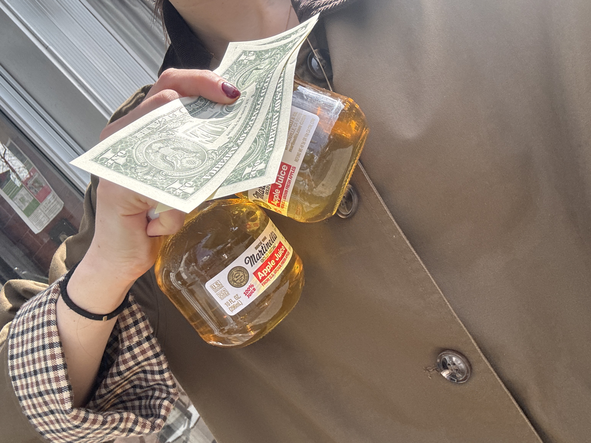 A person wearing a brown coat and a checkered brown and white shirt cuff holds two glass bottles of Martinelli's apple juice and three one-dollar bills. The person appears to be standing outside. The text on the apple juice bottles indicates a manufacturing date of 2024. The label also says, "Watsonville, CA 95078."
