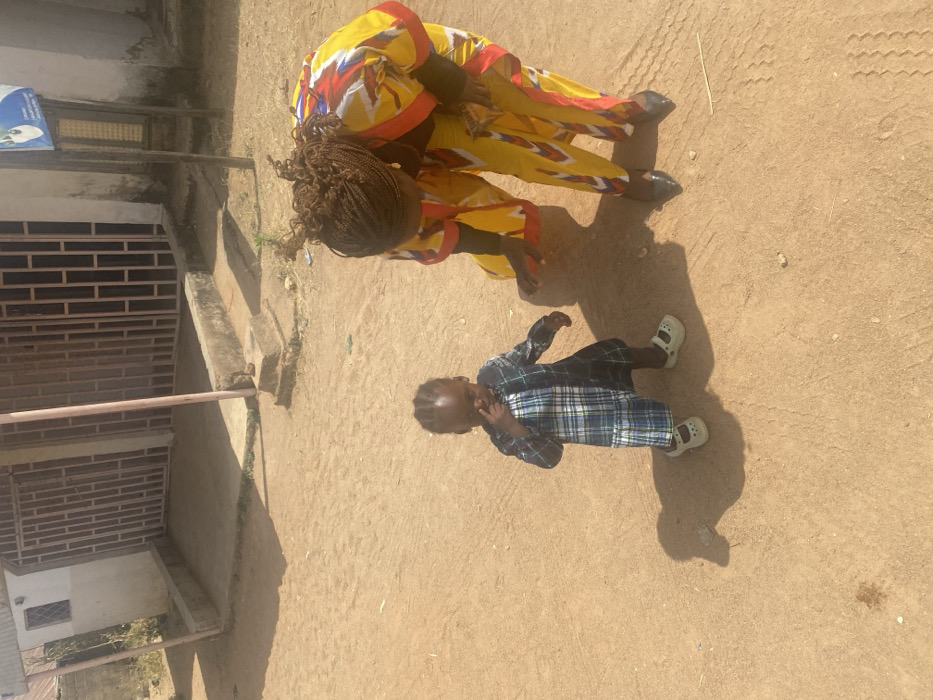 The image captures an outdoor scene in Barakin Akawo, Nigeria. The ground is composed of reddish-brown dirt or sand, showing tire tracks in the lower right. Bright sunlight from above casts clear, short shadows. Two individuals are present: a young child and an adult female. The child, a toddler with dark skin and short dark braids, stands in the center-left. They wear a long-sleeved dress with a plaid pattern of blue, green, and white on the upper half, transitioning to a darker solid color below, paired with light green closed-toe sandals. The child's right index finger is positioned near their nose or mouth, and they face slightly towards the viewer's left. To the right of the child, an adult female with dark skin and braided hair of a brown/auburn hue is bent forward at the waist, looking towards the ground. She is attired in a loose-fitting, vibrant yellow garment featuring red, blue, and white geometric patterns, worn over a black long-sleeved undershirt. Her footwear consists of black pointed-toe low-heeled shoes. Her right hand is extended towards the ground near her feet. In the background, a light-colored building with a raised concrete foundation is visible. It features multiple window or door openings secured by vertical metal bars or grates. A light-colored support pole stands in front of the building's entrance area, and a partially visible blue and white sign is attached to a pole on the building's right side.
