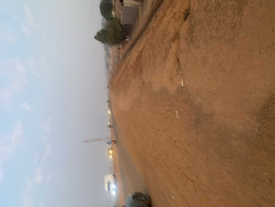 A tilted view captures a desolate landscape. A brown, cracked dirt patch fills the right side, transitioning into a road with sparse vehicles. A few scattered trees and a building are seen further back, followed by a hazy horizon line and light blue sky. A utility pole adds to the urban background. The dull colors and overall lack of vibrancy convey a sense of emptiness and rural decline.