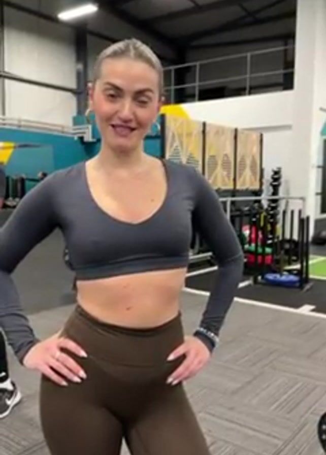 A woman is standing in a gym, talking to the camera. She has fair skin, brown eyes, and her blonde hair is pulled back. She is wearing a long-sleeved gray crop top and brown leggings. She has a ring on her left hand and a bracelet on her right. She is standing with her hands on her hips. In the background, there is a man standing with his arms crossed and gym equipment. The gym has gray and blue walls and a gray floor.