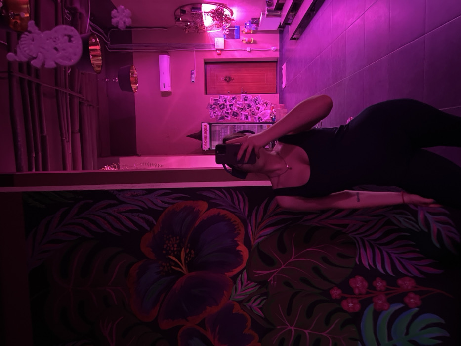 This image depicts an indoor commercial establishment located in Lymanka, Ukraine, distinguished by pervasive magenta and purple ambient lighting. The foreground features a female individual, visible from the chest to the mid-thigh, wearing a black, form-fitting, sleeveless garment. She is holding a dark-colored smartphone up, obscuring her face, consistent with taking a selfie in a reflective surface. A minimalist necklace with a small pendant is visible. To the left of the individual is a dark wall adorned with a large mural depicting tropical flora, specifically prominent purple and pink flowers with contrasting foliage. The background reveals the room's interior. The ceiling features exposed conduits and multiple hanging light fixtures, including two black and gold drum-shaped pendant lights, and decorative white ornaments resembling a snowman and a star. The walls are illuminated in a magenta hue. A white commercial refrigerator with a glass front is positioned against the back wall, to the left of a red door equipped with a brass knocker. Above the door, a white sign with red text (likely "ВИХОД" - Exit) is mounted. A section of the wall to the left of the door is covered with a collage of numerous small photographs or flyers. To the right of the red door, red and white objects are mounted on the wall, and a vertical light strip illuminates a wall-mounted plant display within a half-oval container. The floor is tiled, reflecting the magenta light, and a tiered seating or step area is visible on the far right.