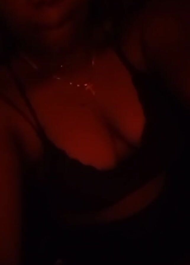 person with dark hair and skin wearing a black top, illuminated by a red light. A necklace with a cross is visible on their chest. The video appears to be taken from a close-up, low angle, focusing on the person's upper body. The overall environment is dimly lit, primarily illuminated by a red light source.