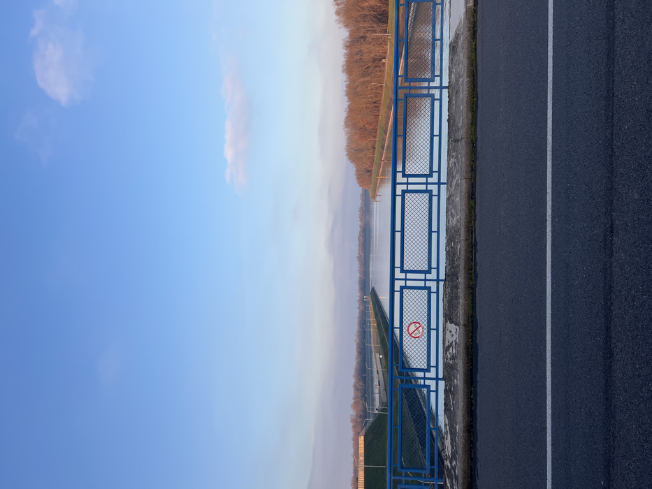 The scene captures a static, eye-level perspective from a bridge over a canal in Gerstheim, France. The foreground consists of a dark asphalt road occupying the bottom quarter of the image, featuring a single solid white line horizontally across its width. Above the road, a grey, textured concrete barrier precedes a blue metal bridge railing that spans the entire width of the frame. This railing is constructed from blue horizontal and vertical bars framing rectangular mesh panels. A circular "No Smoking" sign, red with a white cigarette symbol crossed by a red diagonal line, is affixed to a mesh panel on the left side of the railing, approximately one-third from the left edge. Beyond the railing, a wide, calm canal extends into the background. Its surface reflects the sky and the banks. The left bank features a green grassy slope leading to concrete retaining structures along the water's edge, lined with multiple streetlights or utility poles that recede into the distance. Faint, light-colored structures are visible on the far left horizon. The right bank is densely populated with bare deciduous trees, displaying brown and reddish-orange foliage, suggesting late autumn or winter. A narrow paved path runs along the right bank between the trees and the water. The background shows the canal continuing into the distance, eventually obscured by a light atmospheric haze. The sky above is a clear, bright blue, transitioning to a lighter, faintly pinkish-white hue closer to the horizon. Two small, isolated white clouds are present in the upper right portion of the sky. No individuals or active movements are observed.