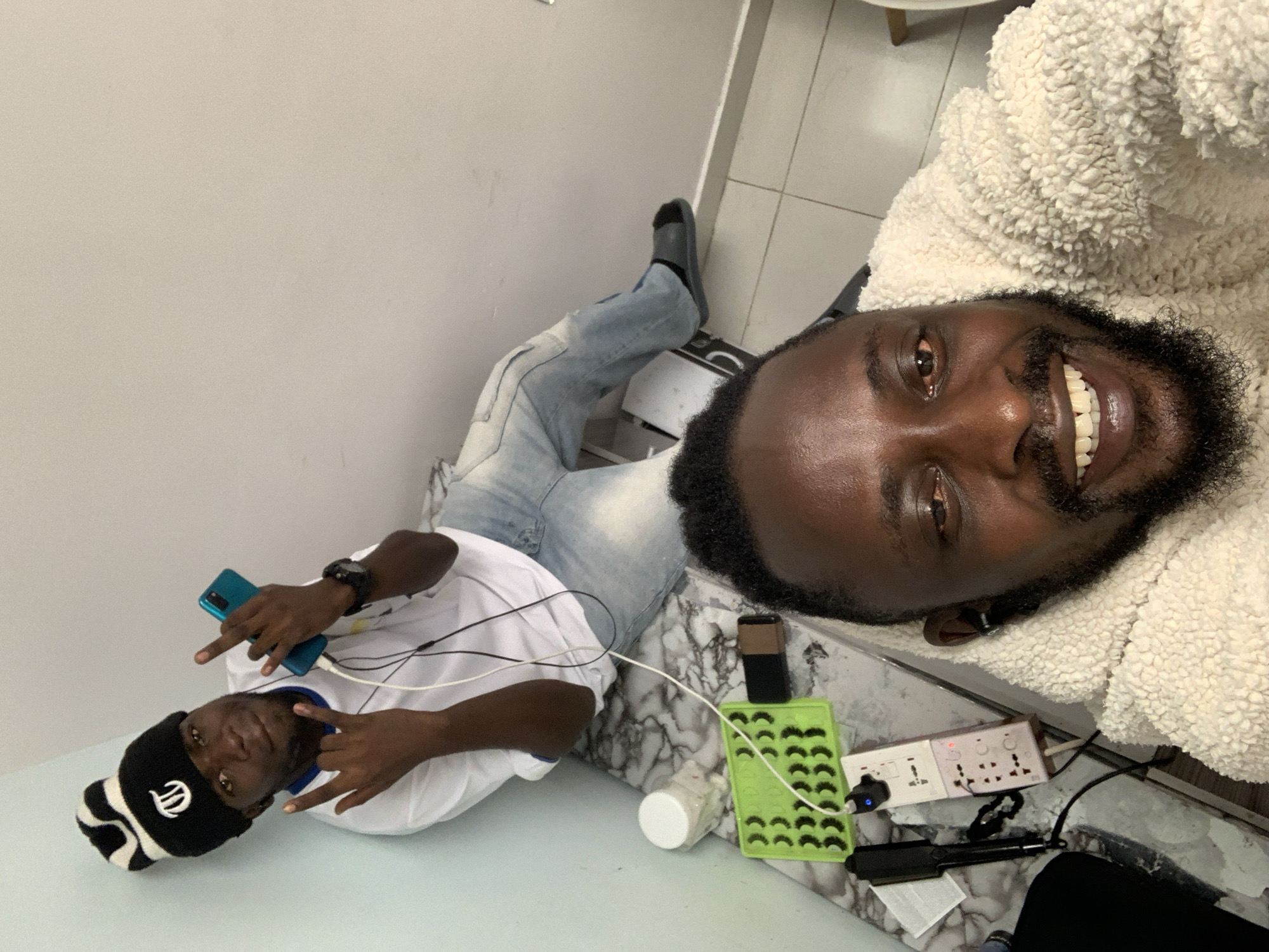 The image, taken in Lekki, Nigeria, depicts two males in an indoor setting. The primary subject, in the foreground, is a dark-complexioned male with a beard, wearing a cream-colored textured fleece garment and an earbud in his right ear. He is smiling and looking directly at the camera, apparently taking a selfie. In the background, a second dark-complexioned male is seated or perched on a marble-patterned surface against a light blue wall. He is wearing a black and white striped beanie with a white logo, a white t-shirt with blue trim, light blue jeans, and dark slides/slippers. A dark-colored watch is visible on his left wrist. He holds a teal smartphone in his left hand, which is connected by a white cable, and his right hand is raised, forming a "rock on" gesture. Wired earphones are visible, connected to his phone. The marble-patterned surface extends into the foreground, cluttered with various items. From left to right, these include a white lidded jar, a light green silicone tray containing rows of false eyelashes, a black rectangular device (possibly a power bank), and a white multi-socket extension cord with a blue indicator light. A white charging cable, likely for the background subject's phone, is plugged into this extension cord. Further right, a black hair-straightening iron and a piece of white paper are visible. The floor, partially visible at the bottom right, is light-colored tile. The surrounding walls are light blue on the left and a light beige/off-white on the right and top.