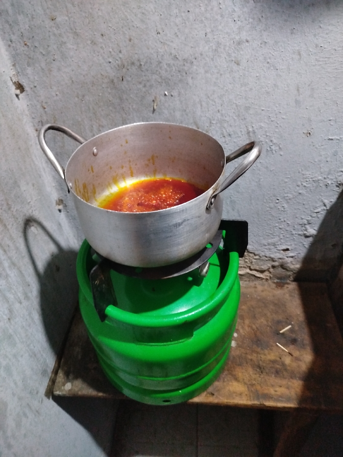 In an interior room located in Mape, Nigeria, a silver-colored aluminum pot containing a reddish-orange stew or sauce is positioned centrally