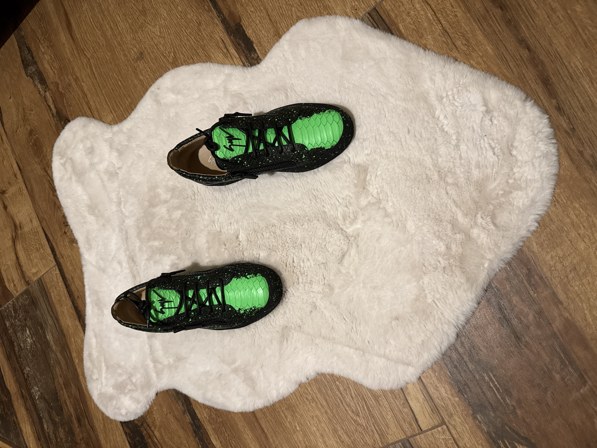 Two Giuseppe Zanotti branded sneakers are positioned indoors on an off-white, irregular-shaped faux sheepskin rug