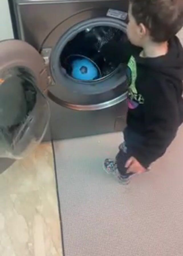 A young child is standing in front of an open, front-loading washing machine. The child is wearing a black hooded sweatshirt and blue sweatpants with floral patterned shoes. The child reaches into the washing machine drum and pushes a blue, circular object. The washing machine is silver and the brand is LG. The washing machine is sitting on a light grey rectangular mat with a grid pattern. The floor is light beige and marbled.