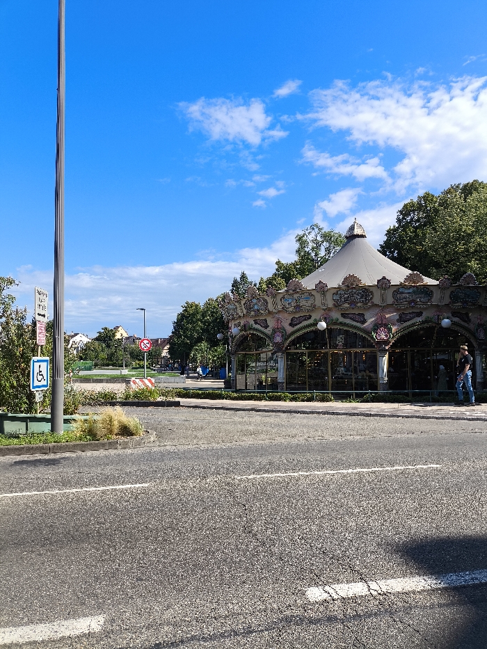- "This daytime photograph depicts the Carrousel de la Place Rapp in Colmar, France, viewed from an adjacent asphalt road under a clear blue sky with scattered white cumulus clouds" by FM-NIq6z1, licensed under CC BY 4.0