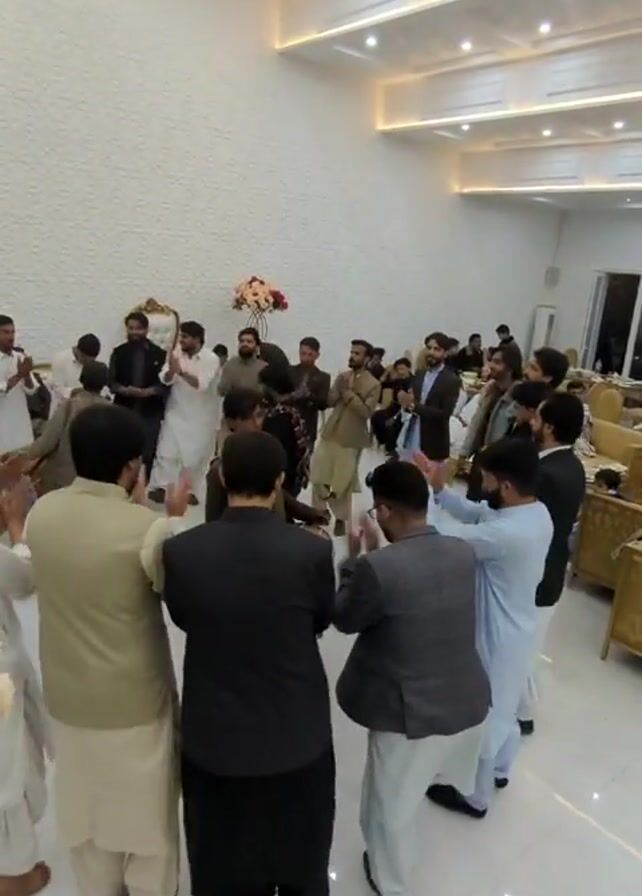 A group of men are dancing in a well-lit hall. The hall has white textured walls and a glossy white floor. A man in the center of the group is playing a drum. The other men are clapping and dancing in a circle around him. Most of the men are wearing traditional South Asian clothing, including shalwar kameez. Some are wearing vests or jackets over their clothing. There are several floral arrangements visible in the hall. Some of the men are using their cell phones to film the scene.